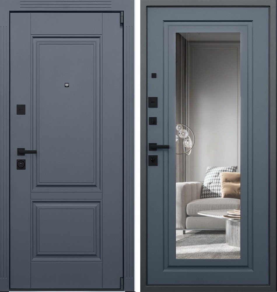Порошковое покрытие "муар серый". Панель МДФ 16 мм. Объемная фрезеровка. Цвет "графит". Наличник МДФ: толщина 16 мм, ширина 85 мм.